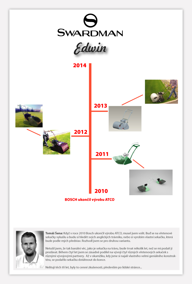 A značka ATCO vs. Swardman? Nechť GGP, které značku ATCO koupilo, řekne, zda už se jim investice vrátila. Swardman je neznámá značka, ale to byl i Apple, než začal konečně vyrábět funkční věci. Nemám ambici otevřít nablískaný showroom v shopping parku, nemám chuť hrát divadlo dobře prosperující firmy, pokud tomu tak není. Jsme na začátku a vývoj Edwina stál na naše poměry hodně. Musíme se ohánět, abychom žili, musíme mít velmi spokojené zákazníky. Proto si nemůžeme dovolit, nabízet „nějakou“ sekačku. Aby se nám dobře prodávalo, musíme mít objektivně tu nejlepší (poměr cena/výkon).