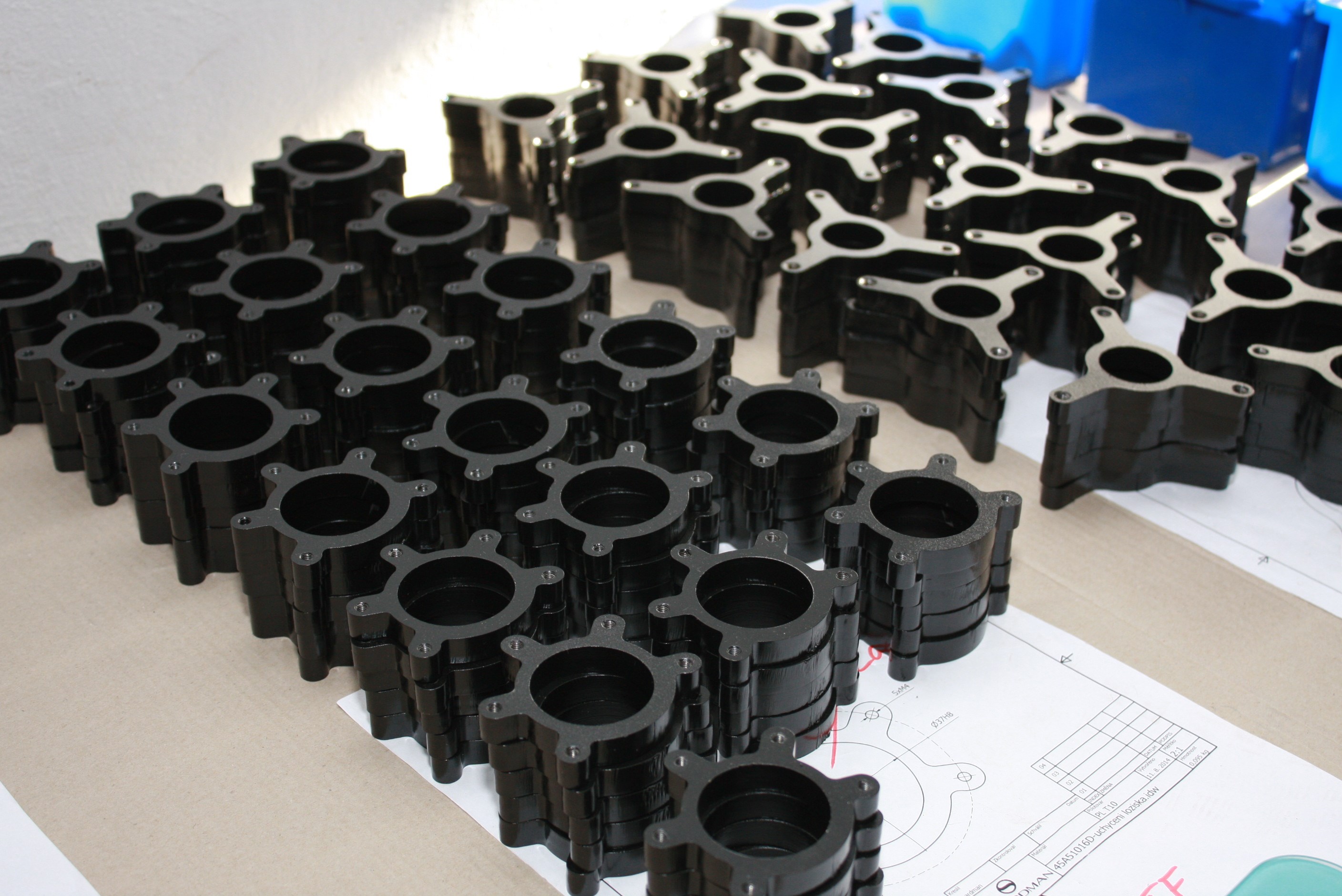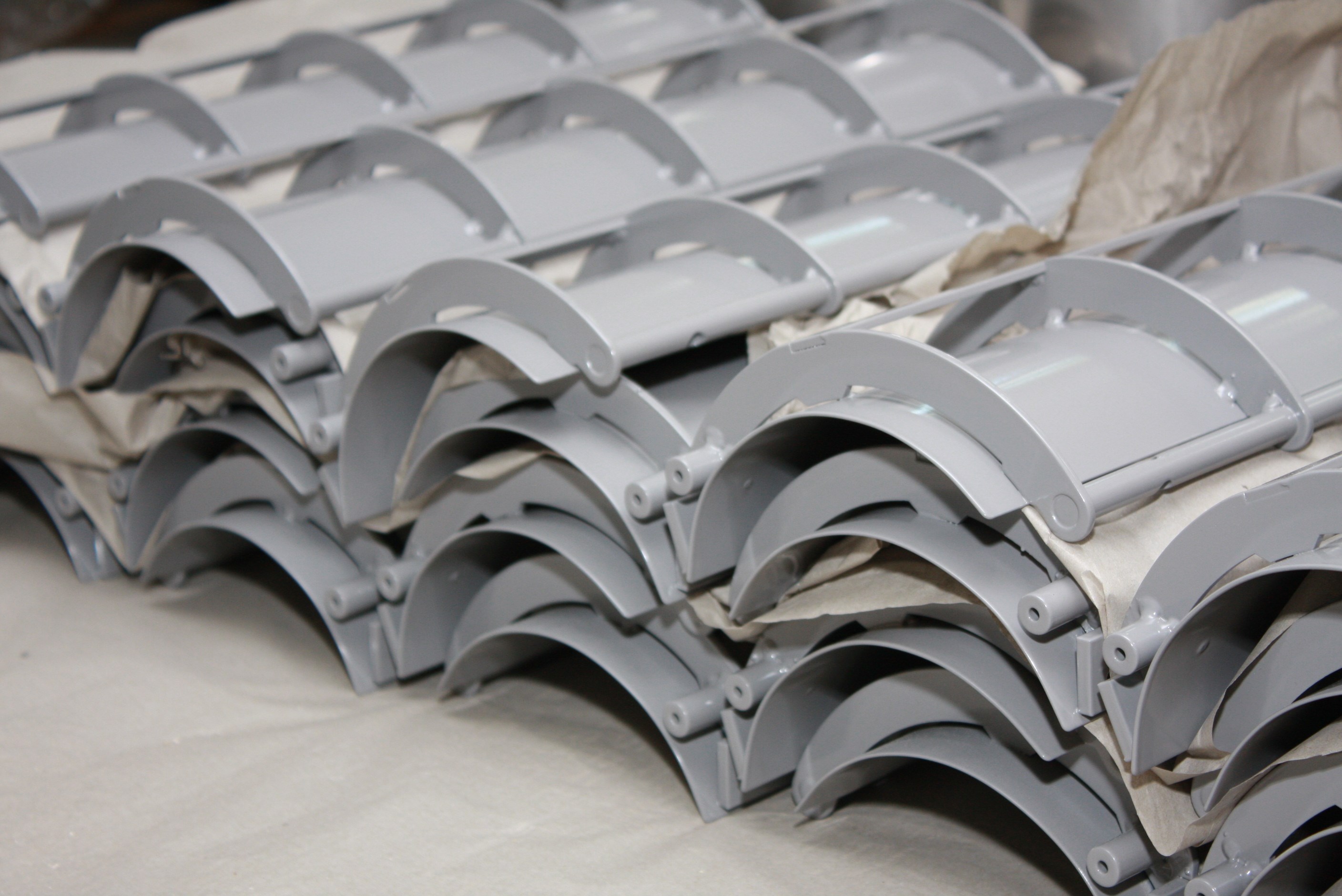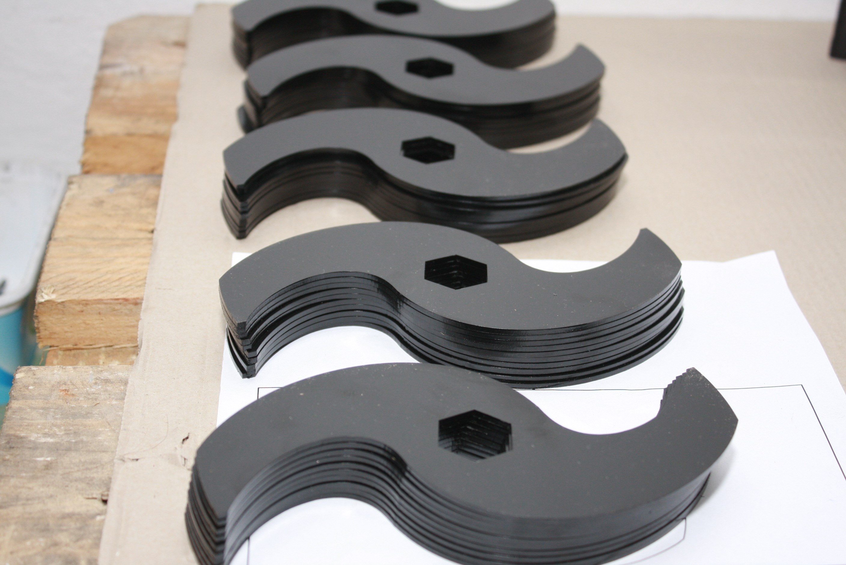 Krásné detaily jednotlivých komponent vřetenové sekačkyPřipravené nože vertikutátoru k montážiVysoce kvalitní povrchová úprava na každém díluNerezové zadní válce srovnané do pyramidyTěla řídítek a ovládací pákyČást kazety s vřetenemUž jen nasadit ložiska