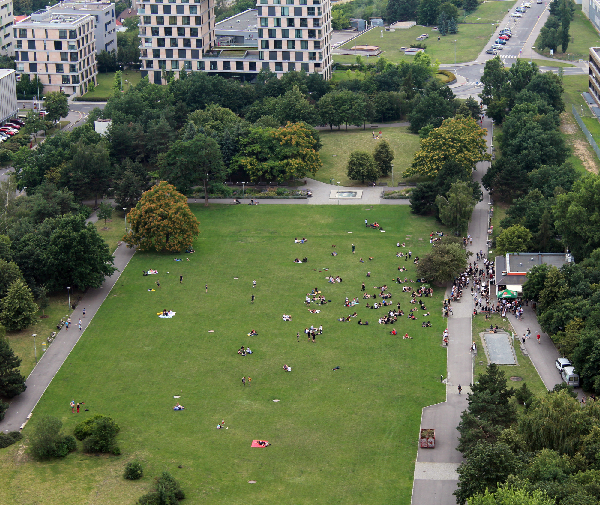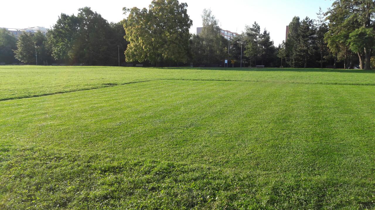 Aktuální pohled na trávník v Centrálním parku. Velký podíl hrají netrávy, ale s jejich omezením počítáme až na závěr sezóny, aby následný dosev měl efekt. Každopádně téměř letecký snímek z 22. července ukazuje, že našich 300 m2 kosených vřetenovou sekačkou Swardman Edwin se zeleností jasně odlišuje od zbytku parku. A to je navíc hlavní travnatá plocha ošetřována intenzivněji než zbylé travnaté plochy.