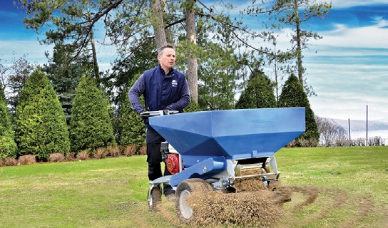 Co však v jednom lze zvládnout jen těžko, je topdressing, což je aplikace písku, kompostu, na celý trávník a zapravení tohoto materiálu do trávy. Tam už hraje roli, kde je materiál složený, jak daleko to na trávník od toho místa je, jak je trávník svažitý a členitý… Pro jednoho to může být masakr zvládnout to za den. Pak se může stát, že člověk netrénovaný, nemá chuť během dalších pár dnů, možná týdnů, dělat další podobnu akci. Přitom aerifikace s pískováním je nejlepší dělat v období srpen – září, pokud je závlaha, tak lze již od května. Zapískování jsem vyřešil získáním výhradního zastoupení kanadských motorových ručně vedených rozmetadel EcoLawn. To je stroj, který pohodlně obslouží a pečlivě rozprostře materiál, na malých i velkých trávnících.